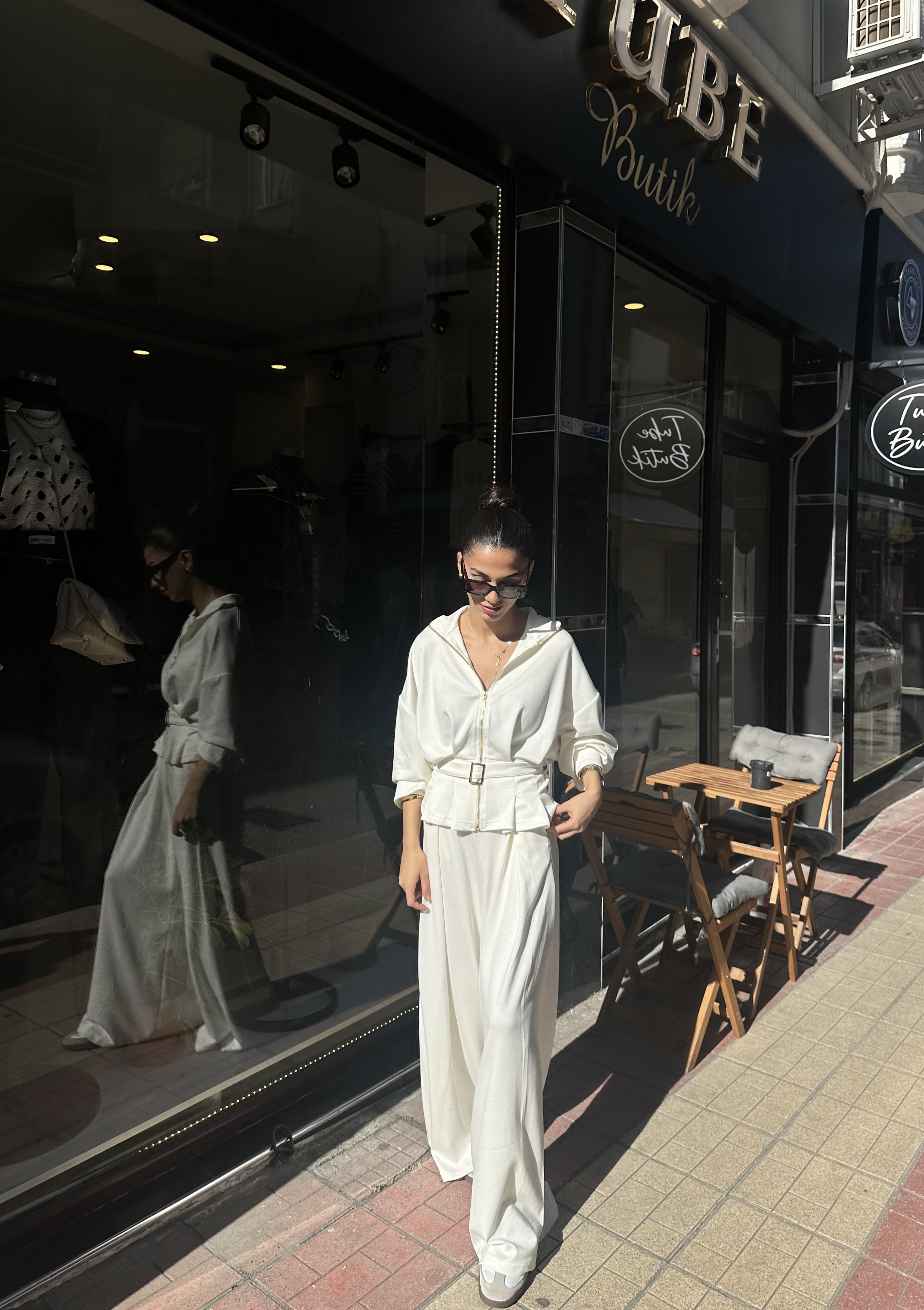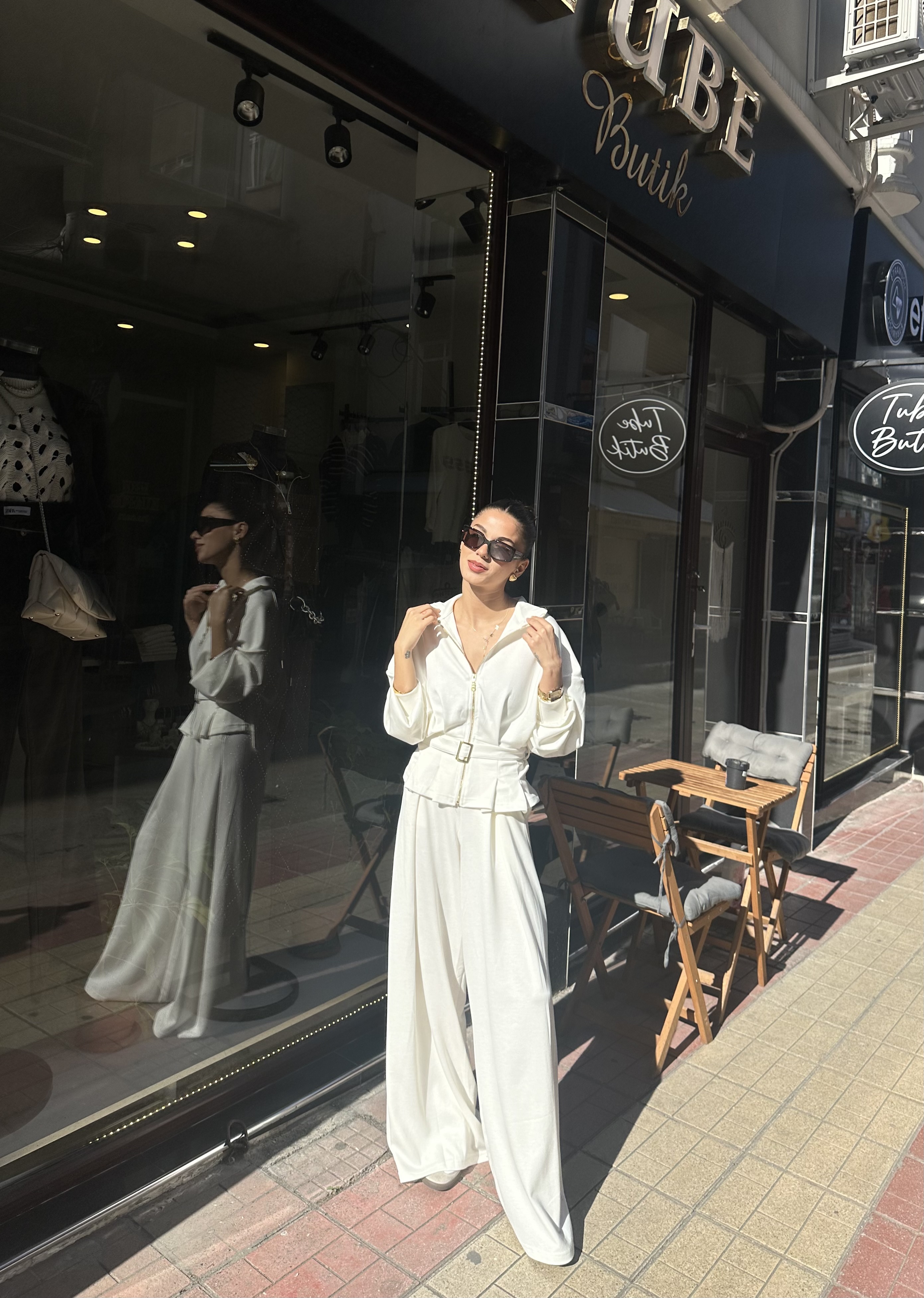 Kemer Detaylı Geni̇ş Paça Pantolon Beyaz Takım | Tube Butik